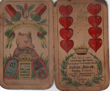 Sehr schlecht erhaltenes Sächsisches Einfachbild von Julius Booch ohne Steuerstempel auf Rot Daus, FZ auf Rot Unter und Firmenname auf Rot Acht, mit Genreszenen auf den Nebenkarten. Schellen Unter fehlt. |