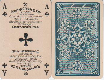 Standardbild von VASS. Nur auf den Assen befindet sich Werbung für die auch heute noch existierende Firma Kempchen&Co aus Oberhausen. Herz As und Kreuz Bube fehlen, FN auf Herz 7. |