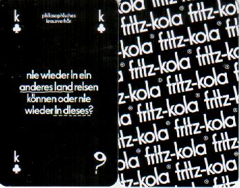 Die Bildkarten sind Comichaft gestaltet, wobei jeweils ein Flasche mit eingefügt wurde. Auf den Assen ist jeweils die gleiche Kola Flasche abgebildet. Auf den Zahlenkarten befinden sich verschiedene Sorten der Marke. Gleiche Werte-gleiche Bilder. in original Pappschachtel |
